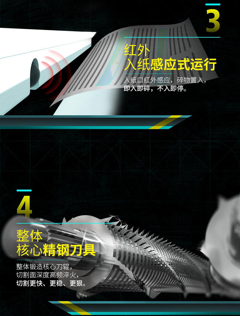 24小時(shí)持續(xù)粉碎 切割器5年質(zhì)保 門開滿紙過自動(dòng)停機(jī) 風(fēng)冷系統(tǒng)工作持久 整體鋼刀耐用持久 具有過熱停機(jī)保護(hù) 卡紙自動(dòng)反轉(zhuǎn)保固