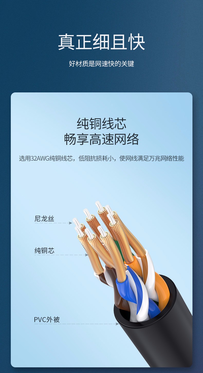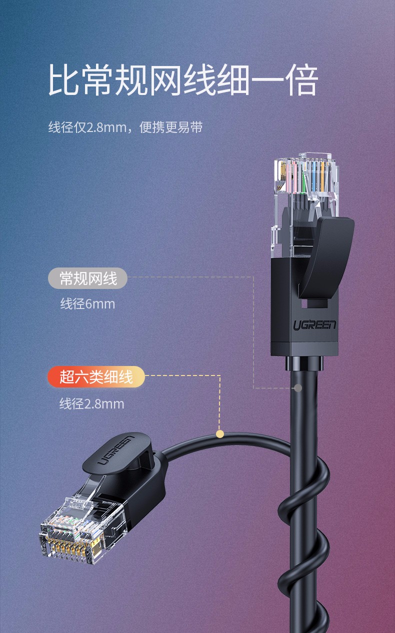綠聯(lián)網(wǎng)線 NW122 超六類萬兆網(wǎng)線細(xì)線 CAT6A類純銅鍍金八芯雙絞非屏蔽網(wǎng)絡(luò)跳線 1米 單位:根