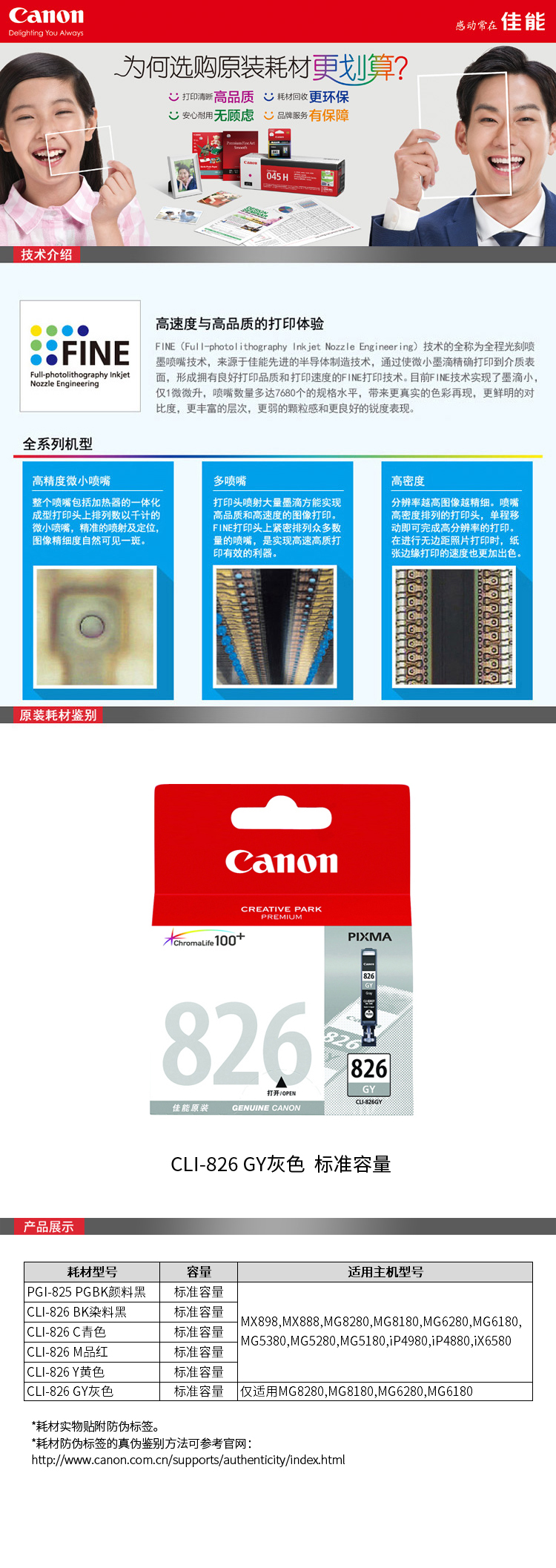 佳能墨盒 CLI-826 灰色墨盒 適用:MX898、MG6280、iP4980、iX6580 單位:支