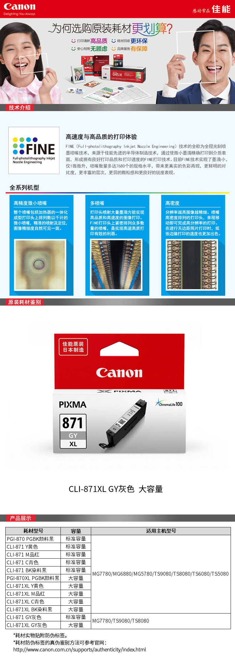 佳能墨盒 CLI-871XL 灰色墨盒 適用:MG7780、TS9080、TS8080、TS6080 單位:支