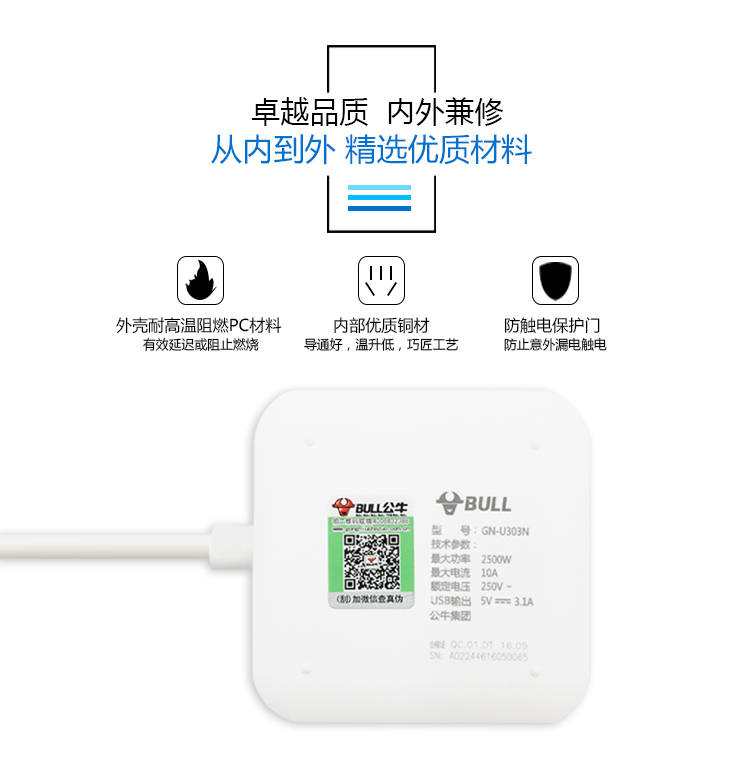 公牛插座 GN-U303U 1.5米3孔帶3個(gè)USB口接線板立式 單位:個(gè)