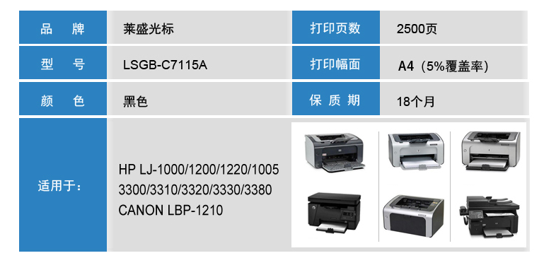 萊盛光標(biāo) LSGB-C7115A 黑色粉盒 適用:HP LJ-1000/1200/1220/1005/3300/3310 單位:支