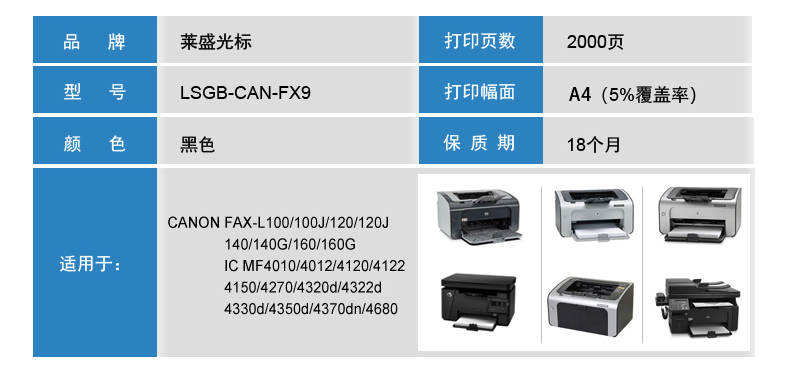 萊盛光標(biāo) LSGB-CAN-FX9 黑色粉盒 適用:CANON FAX-L100/100J/120/120J/140 單位:支