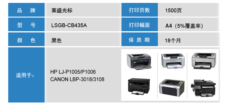 萊盛光標(biāo) LSGB-CB435A 黑色粉盒 適用:HP LJ-P1005/P1006 CANON LBP-3018 單位:支