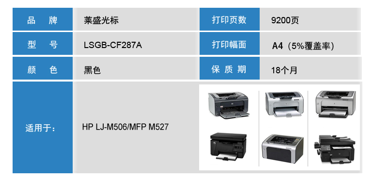 萊盛光標(biāo) LSGB-CF287A 黑色粉盒 適用:HP LJ-M506/MFP M527 單位:支