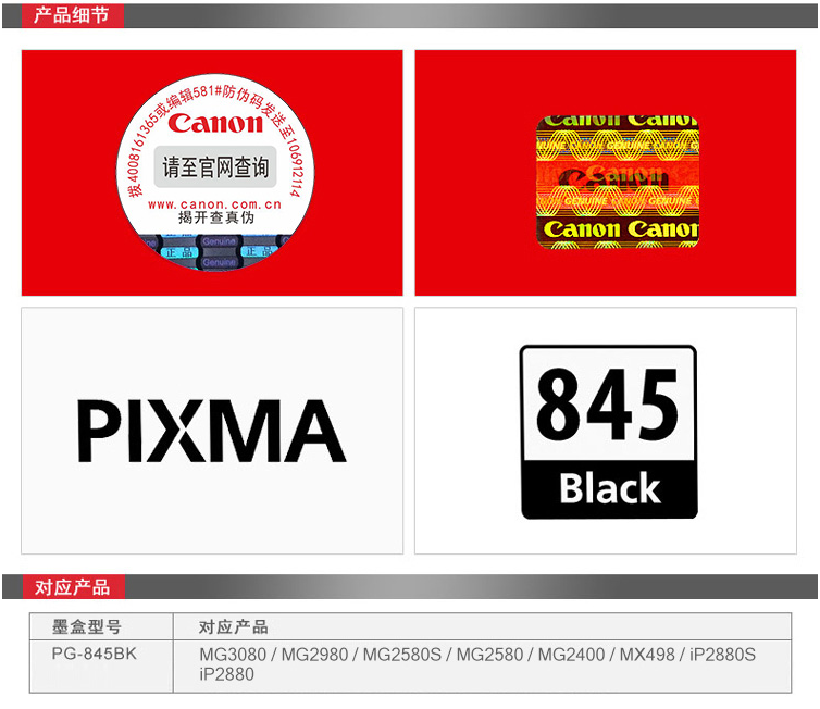 佳能墨盒 PG-845BK 黑色墨盒 適用:MG3080、MG2580、MX498、iP2880 單位:支