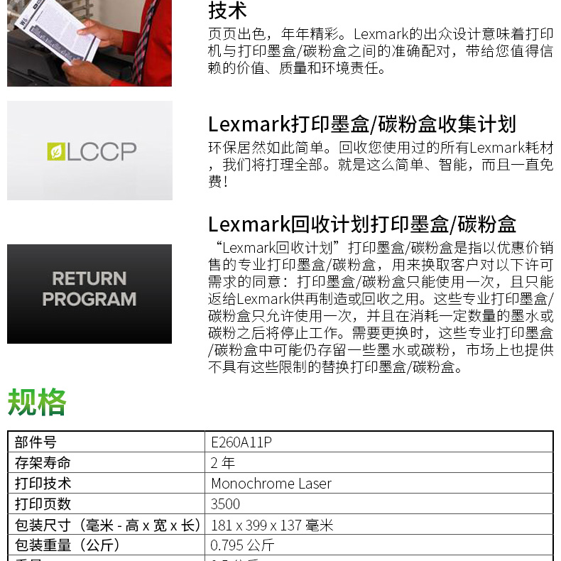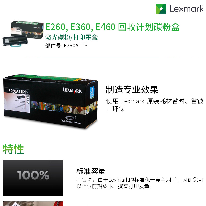 利盟墨粉 E260A11P 黑色 適用E260/360dn/d E460dn/dw E462dtn(約3500頁) 單位:支