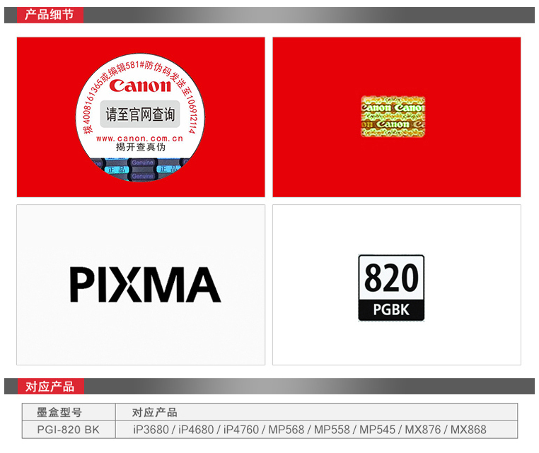 佳能墨盒 PGI-820BK 黑色墨盒 適用:iP3680、iP4680、iP4760、MX868 單位:支