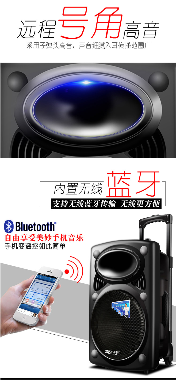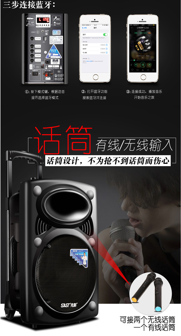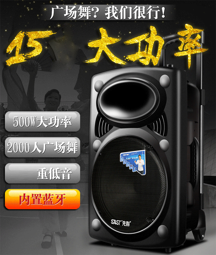 先科(SAST) A90 15英寸大功率重低音廣場舞音響 移動戶外藍牙拉桿音箱 便攜式擴音器