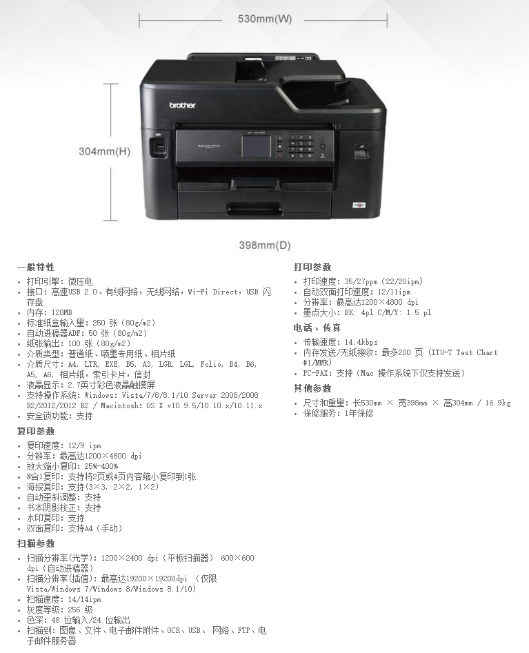 兄弟多功能一體機(jī) MFC-J2330DW 彩色噴墨A3 單位:臺(tái)