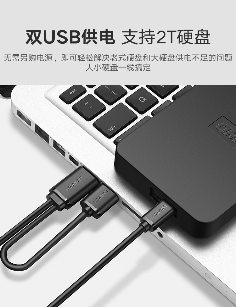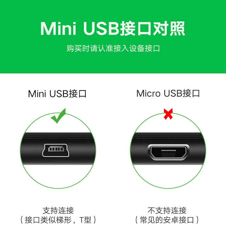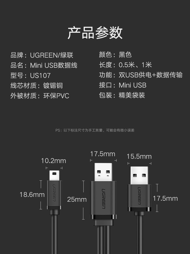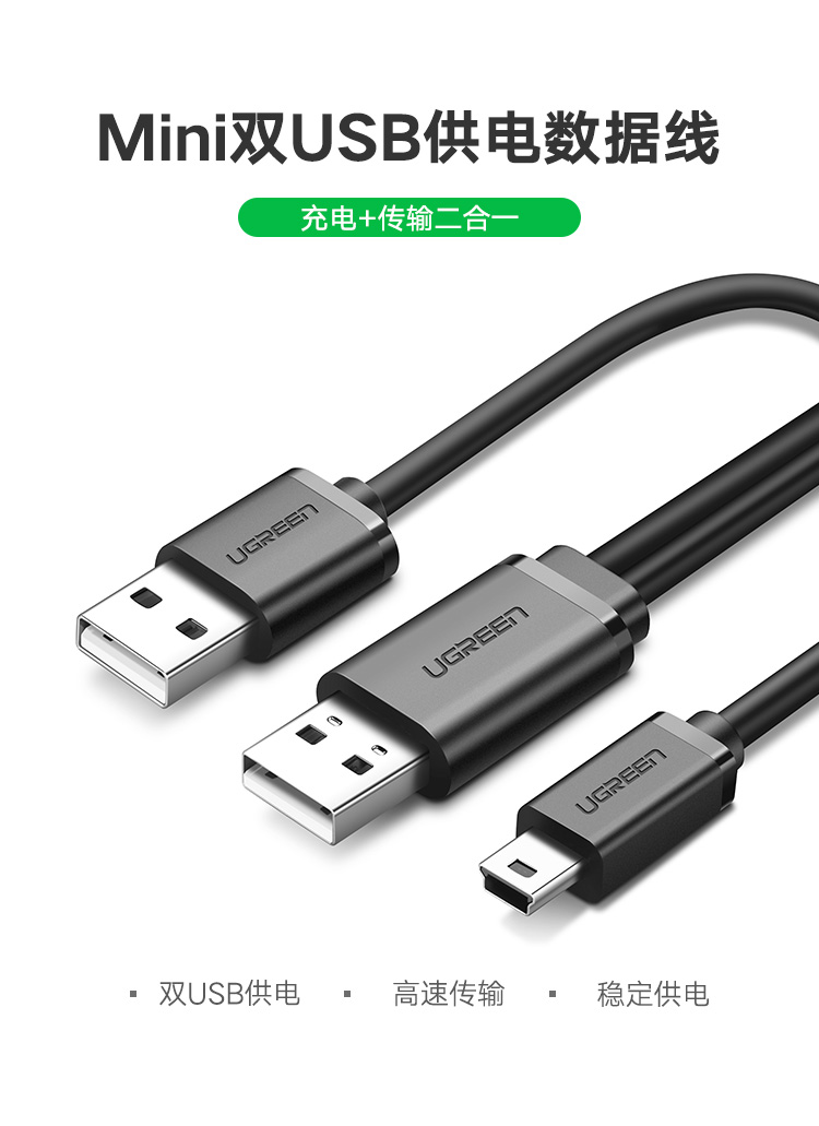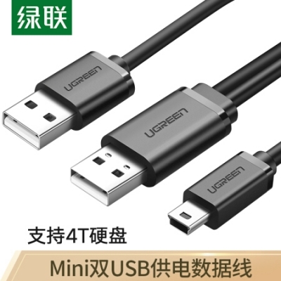 綠聯(lián) US107 USB2.0轉(zhuǎn)Mini USB數(shù)據(jù)線T型接口電源充電連接線帶雙供電頭 1米 黑色 單位:根