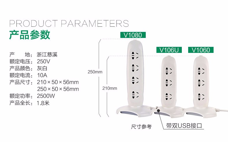 公牛插座 V106U 1.8米6位帶usb塔式多功能立體辦公插座 單位:個(gè)