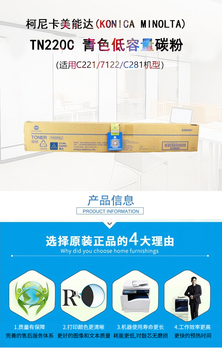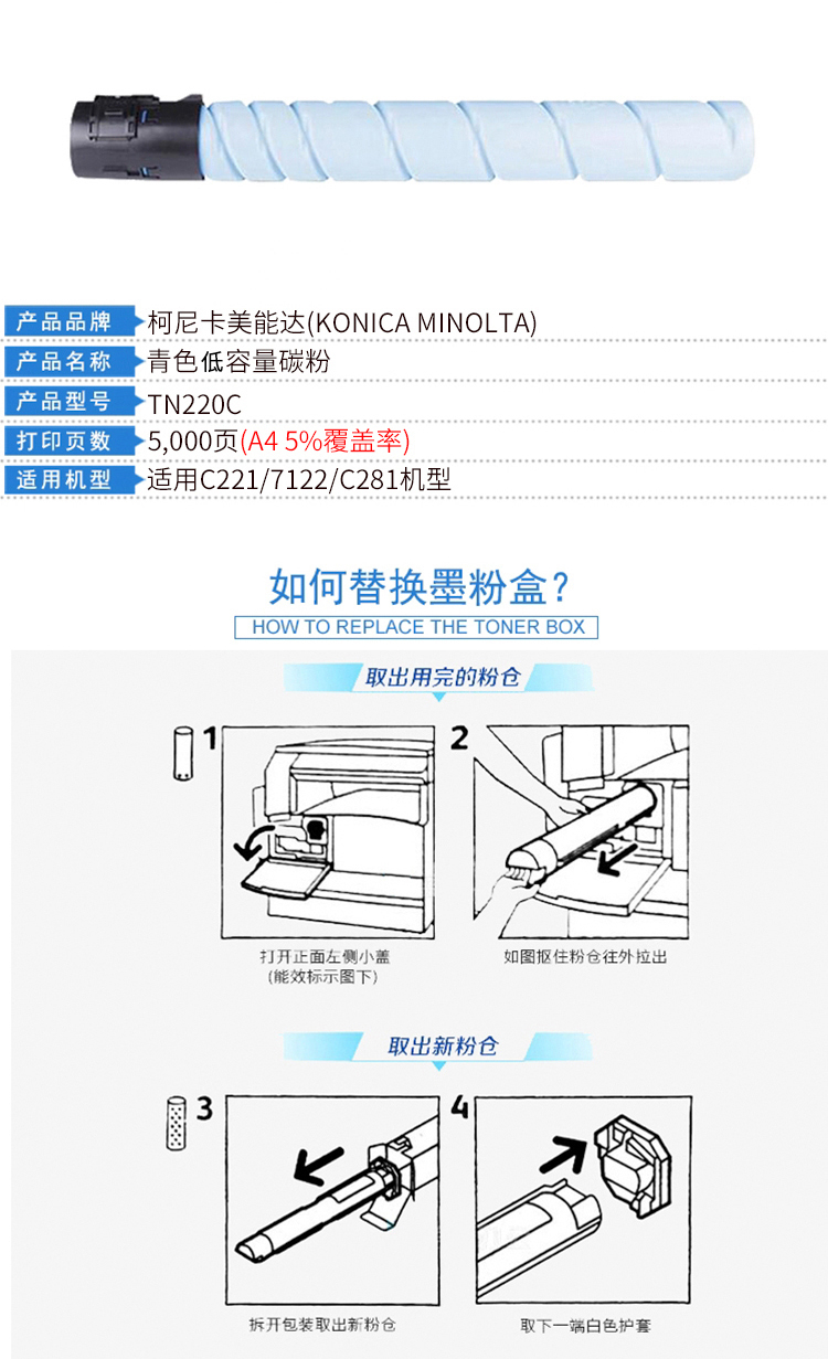 柯尼卡美能達(dá) TN220C 青色粉盒 低容 適用柯美C221S/C221/C281/C7122/C712復(fù)合機(jī) 單位:支