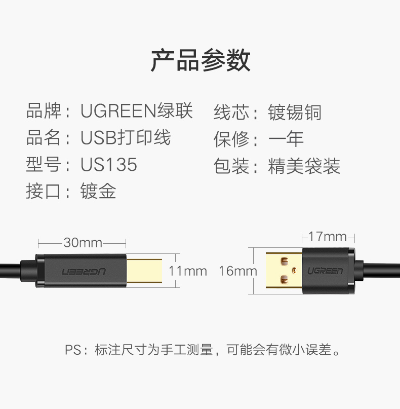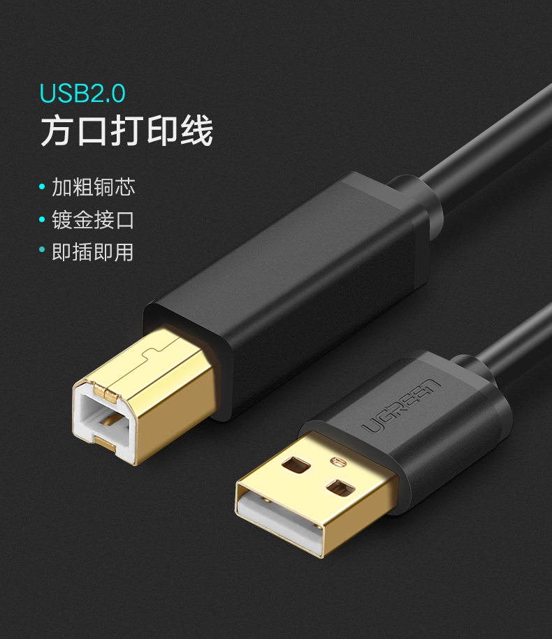 綠聯(lián) US135 USB2.0高速打印機(jī)數(shù)據(jù)線方口連接線鍍金接頭A公對(duì)B公AM/BM適用惠普HP佳能愛普生打印機(jī)生 2米 黑色 單個(gè)裝