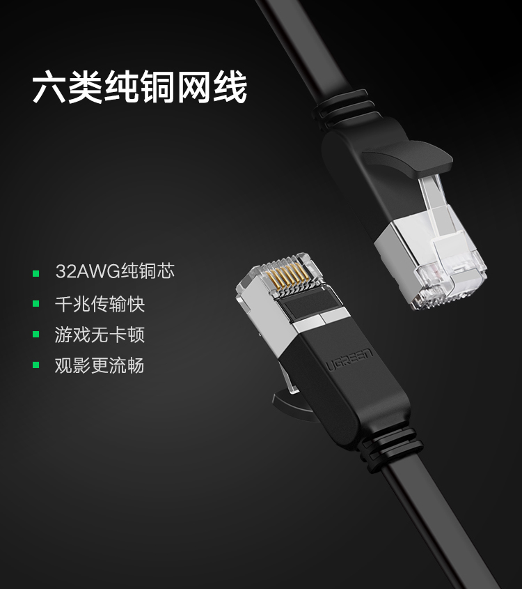 綠聯(lián) NW101 六類網(wǎng)線 純銅CAT6類千兆網(wǎng)絡(luò)連接線 電腦寬帶家用非屏蔽扁平跳線成品網(wǎng)線 扁線 3米 黑色 單個(gè)裝