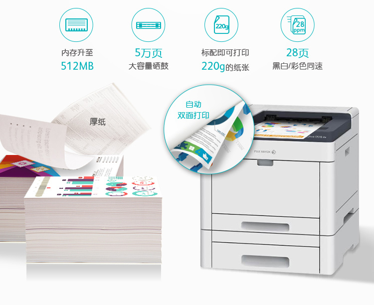 A4彩色,黑白彩色同速28PPM,1200X2400dpi,512MB內(nèi)存,標(biāo)配網(wǎng)絡(luò)打印,標(biāo)配雙面打印,首頁輸出彩色9.2秒,黑白8.2秒