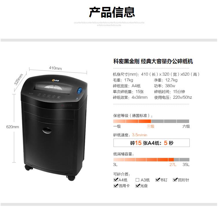 科密碎紙機 黑金剛 經(jīng)典大容量辦公碎紙機(碎卡光盤/高速靜音) 單位:臺
