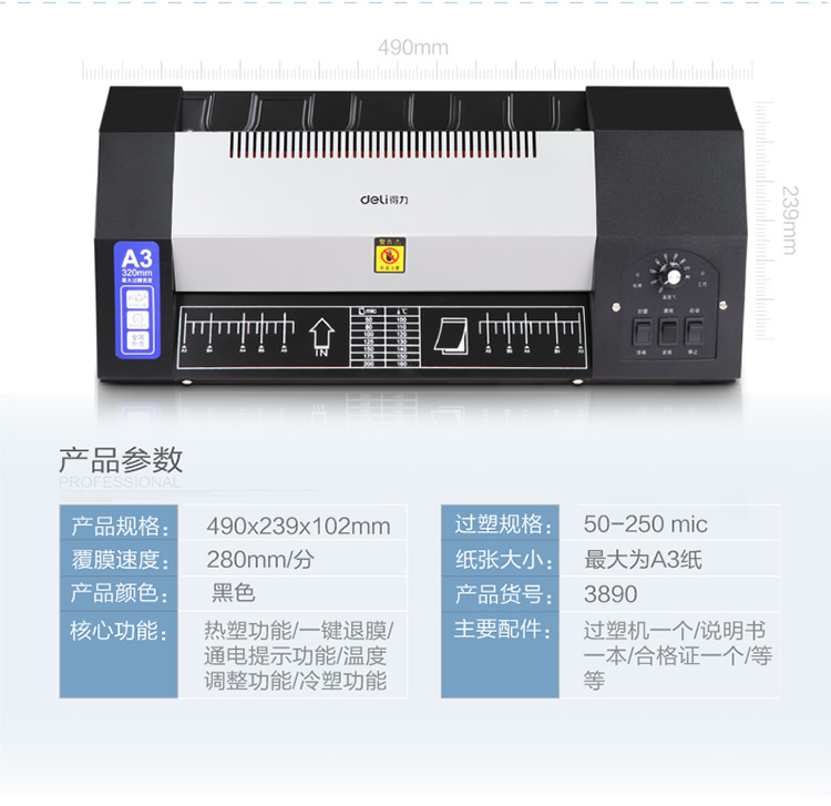 得力塑封機(jī) 3890 A3全金屬大功率塑封機(jī) 單位:臺(tái)