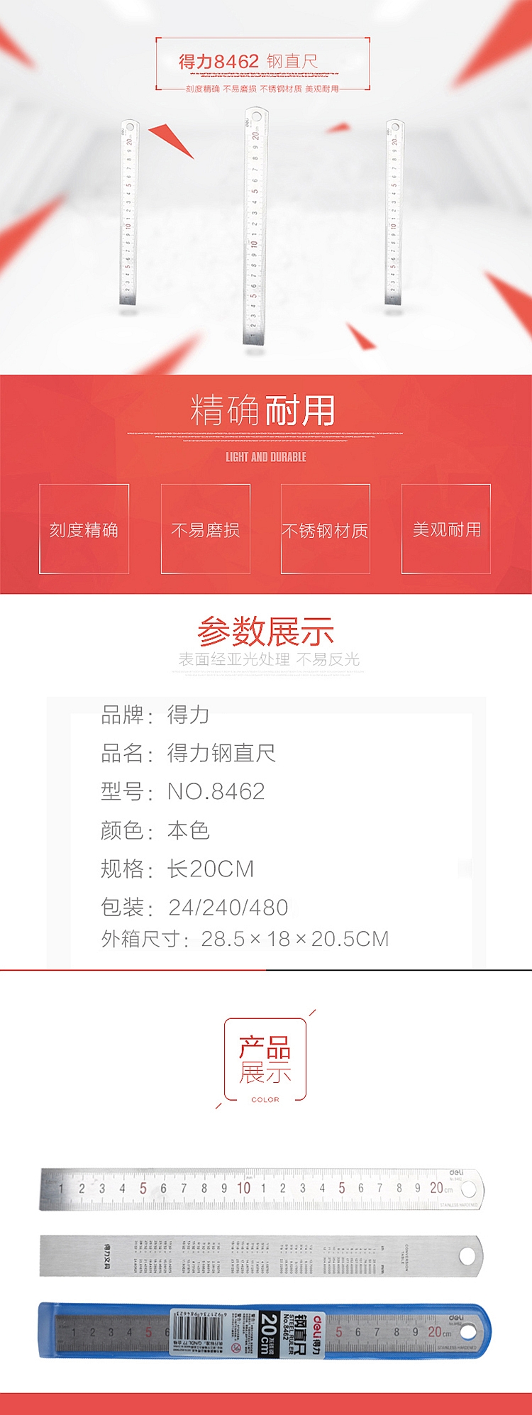 得力鋼尺 8462 鋼直尺 20cm 單位:把