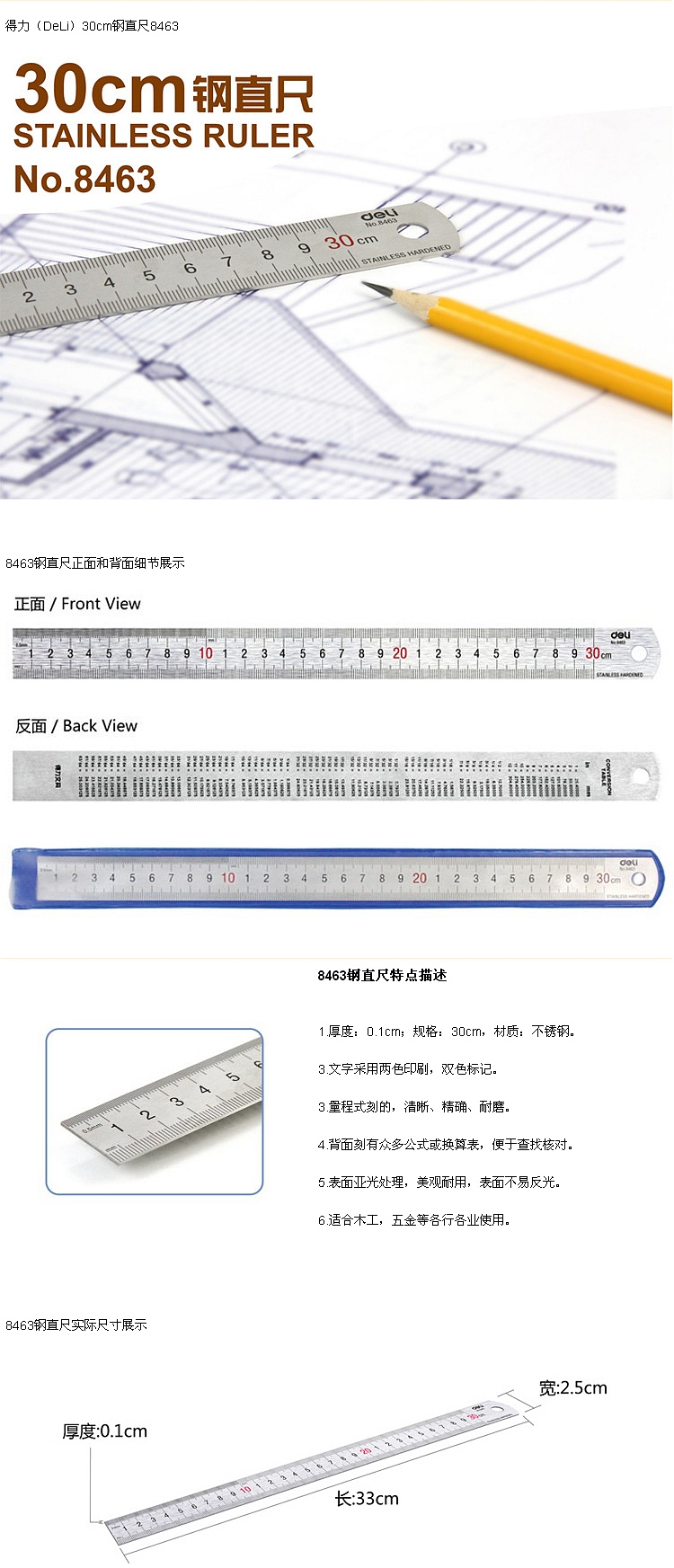 得力直尺 8463 鋼直尺 30CM 單位:把