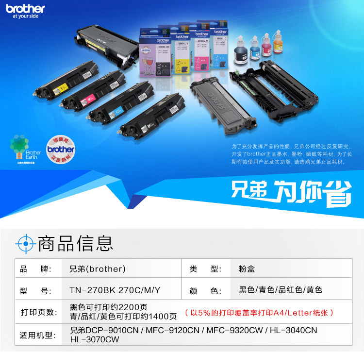 兄弟墨粉 TN-270BK 黑色粉盒 適用:機(jī)型HL-3040CN/MFC-9320CW/9120CN/1DCP-9010CN HL-3070C 單位:支