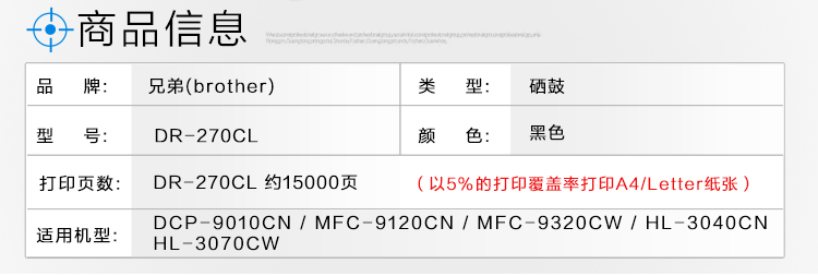 兄弟硒鼓 DR-270CL 黑色硒鼓 適用:DCP-9010CN/MFC-9120CN/9320CW/HL-3040CN/3070CW 單位:支
